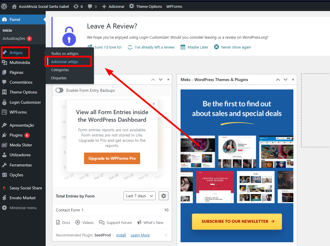 2. Entre agora ao lado esquerdo em "Artigos" e após em "Adicionar artigo"