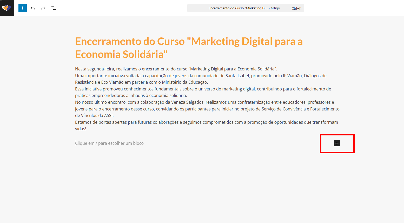 3. Agora preencha os campos de título clicando no campo título e digitando/colando o conteúdo, após clique no campo de baixo para colocar o corpo do texto e para adicionar a galeria de imagens, clique no sinal de positivo que vai gerar mais abaixo após coloca o corpo do texto, como na imagem: