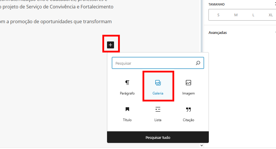 4. Ao clicar irá aparecer para inserir o conteúdo, selecione "Galeria":