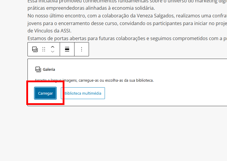 5. O campo se tranformará em um módulo de imagens, então clique em carregar para ir até a pasta de imagens que possui no computador: