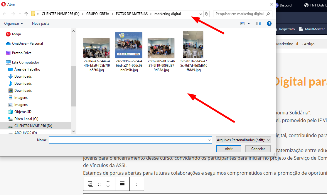 6. Na tela que abrir, navegue até a pasta de suas imagens, selecione todas as imagens para subir e clique em abrir. Interessante trabalhar o tamanho delas antes pois o sistema não diminui a qualidade nem tamanho, imagens muito grandes pode sobrecarretar a abertura do sistema, um tamanho de até 1080px na maioria dos casos é suficiente.