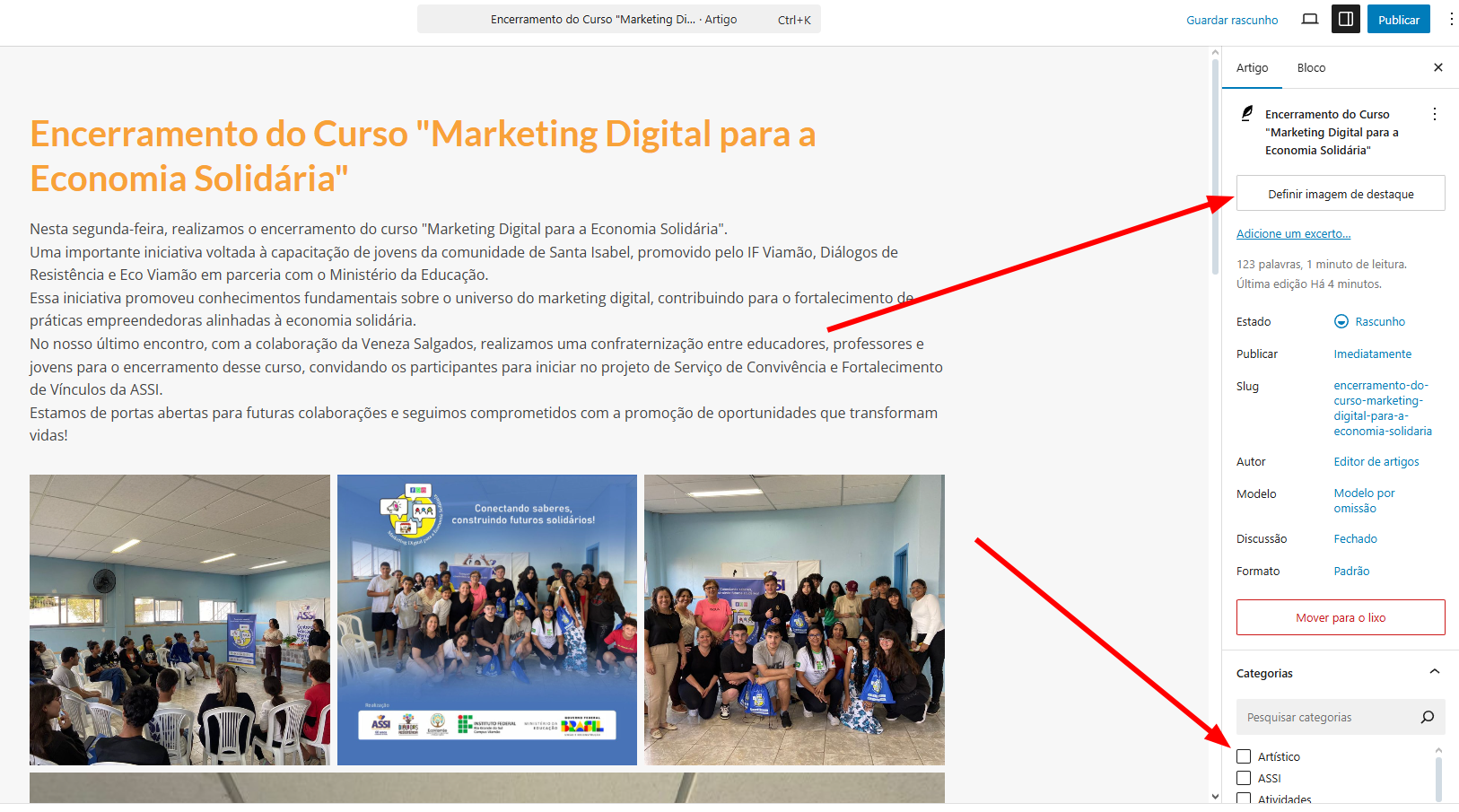 7. Agora vamos definir qual imagem vai aparecer na capa e as categorias que a matéia vai aparecer. defina no menu a direita conforme imagem: