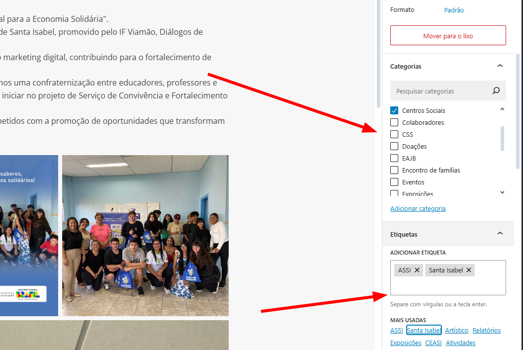 8. Agora é só definir as "etiquetas' caso precise, elas servirão para serem usadas no campo de busca e classificação da matéria: